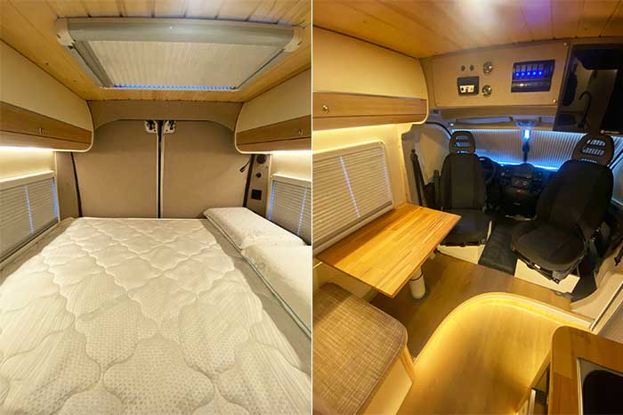 Yatak ve oturma alanları, maksimum konfor ve pratiklik düşünülerek tasarlanır. Günlük kullanımda rahatlık sağlarken, gece dinlenme alanı olarak da mükemmel bir çözüm sunar. Her detayı özenle düşünülmüş iç tasarım, motokaravanınızda evinizde hissetmenizi sağlar.